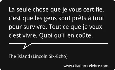 La seule chose que je vous certifie, c'est que les gens sont prêts à tout pour survivre. Tout ce que je veux c'est vivre. Quoi qu'il en coûte.