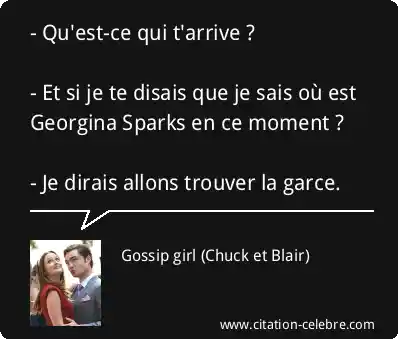 - Qu'est-ce qui t'arrive ? - Et si je te disais que je sais où est Georgina Sparks en ce moment ? - Je dirais allons trouver la garce.