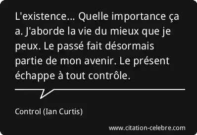 L'existence... Quelle importance ça a. J'aborde la vie du mieux que je peux. Le passé fait désormais partie de mon avenir. Le présent échappe à tout contrôle.