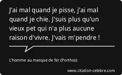 J'ai mal quand je pisse, j'ai mal quand je chie. J'suis plus qu'un vieux pet qui n'a plus aucune raison d'vivre. J'vais m'pendre !