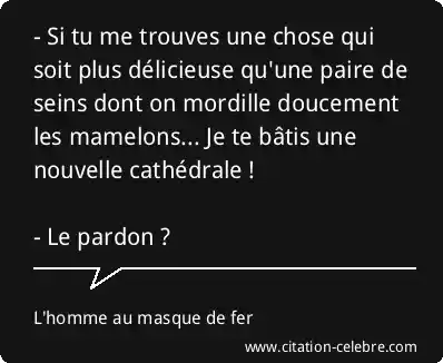 - Si tu me trouves une chose qui soit plus délicieuse qu'une paire de seins dont on mordille doucement les mamelons... Je te bâtis une nouvelle cathédrale ! - Le pardon ?