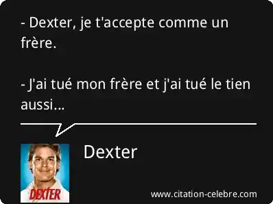 - Dexter, je t'accepte comme un frère. - J'ai tué mon frère et j'ai tué le tien aussi...