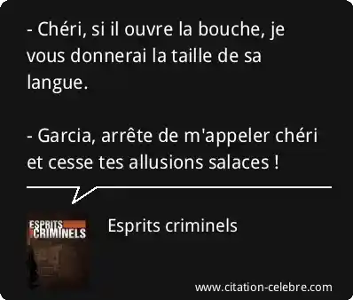 - Chéri, si il ouvre la bouche, je vous donnerai la taille de sa langue. - Garcia, arrête de m'appeler chéri et cesse tes allusions salaces !