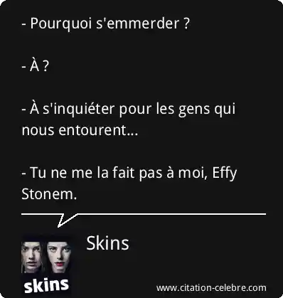 - Pourquoi s'emmerder ? - À ? - À s'inquiéter pour les gens qui nous entourent... - Tu ne me la fait pas à moi, Effy Stonem.