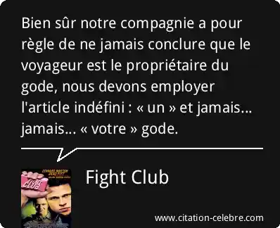 Bien sûr notre compagnie a pour règle de ne jamais conclure que le voyageur est le propriétaire du gode, nous devons employer l'article indéfini : « un » et jamais... jamais... « votre » gode.