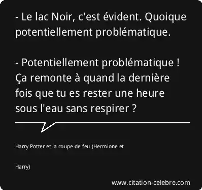 - Le lac Noir, c'est évident. Quoique potentiellement problématique. - Potentiellement problématique ! Ça remonte à quand la dernière fois que tu es rester une heure sous l'eau sans respirer ?