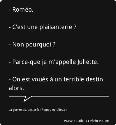 - Roméo. - C'est une plaisanterie ? - Non pourquoi ? - Parce-que je m'appelle Juliette. - On est voués à un terrible destin alors.