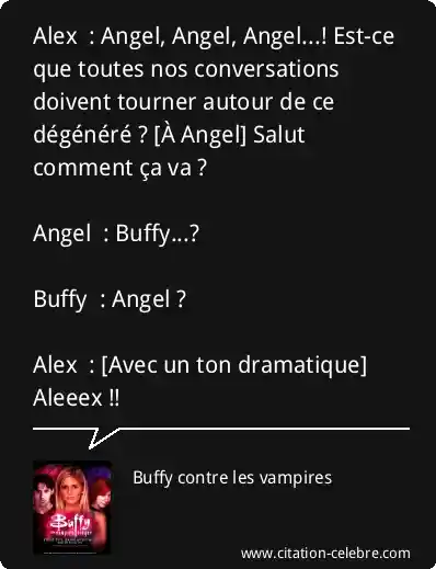 Alex : Angel, Angel, Angel...! Est-ce que toutes nos conversations doivent tourner autour de ce dégénéré ? [À Angel] Salut comment ça va ? Angel : Buffy...? Buffy : Angel ? Alex : [Avec un ton dramatique] Aleeex !!