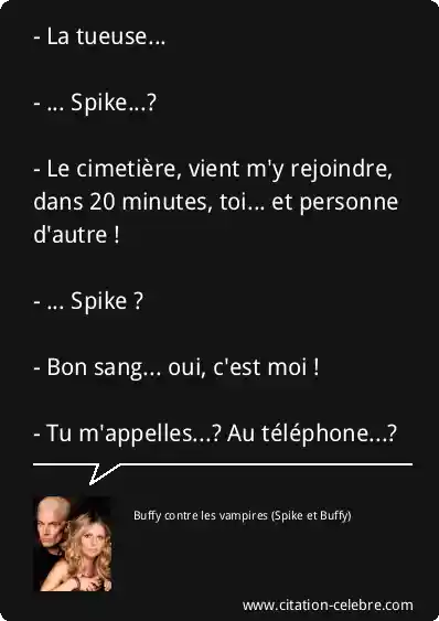 - La tueuse... - ... Spike...? - Le cimetière, vient m'y rejoindre, dans 20 minutes, toi... et personne d'autre ! - ... Spike ? - Bon sang... oui, c'est moi ! - Tu m'appelles...? Au téléphone...?