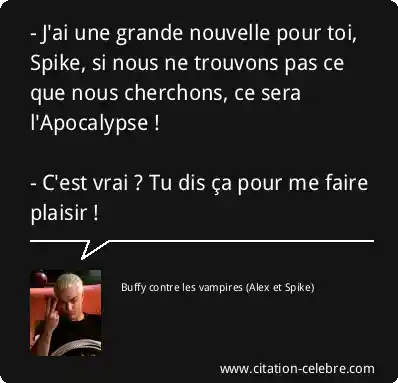 - J'ai une grande nouvelle pour toi, Spike, si nous ne trouvons pas ce que nous cherchons, ce sera l'Apocalypse !