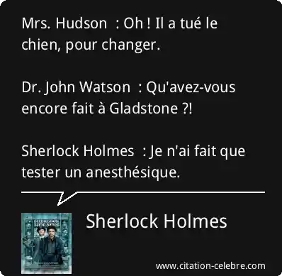 Mrs. Hudson : Oh ! Il a tué le chien, pour changer. Dr. John Watson : Qu'avez-vous encore fait à Gladstone ?! Sherlock Holmes : Je n'ai fait que tester un anesthésique.
