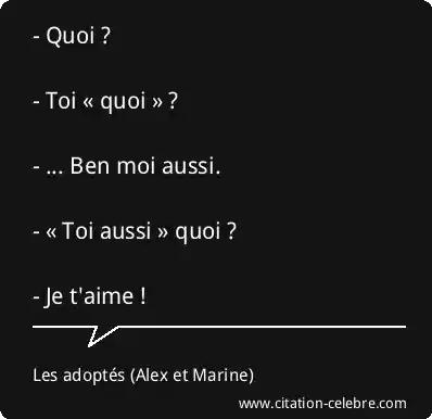 - Quoi ? - Toi « quoi » ? - ... Ben moi aussi. - « Toi aussi » quoi ? - Je t'aime !