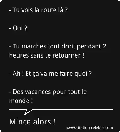 - Tu vois la route là ? - Oui ? - Tu marches tout droit pendant 2 heures sans te retourner ! - Ah ! Et ça va me faire quoi ? - Des vacances pour tout le monde !