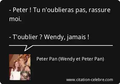 - Peter ! Tu n'oublieras pas, rassure moi. - T'oublier ? Wendy, jamais !