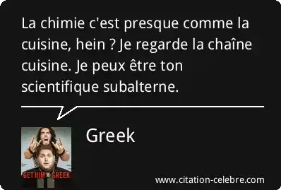 La chimie c'est presque comme la cuisine, hein ? Je regarde la chaîne cuisine. Je peux être ton scientifique subalterne.
