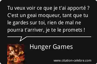 Tu veux voir ce que je t'ai apporté ? C'est un geai moqueur, tant que tu le gardes sur toi, rien de mal ne pourra t'arriver, je te le promets !