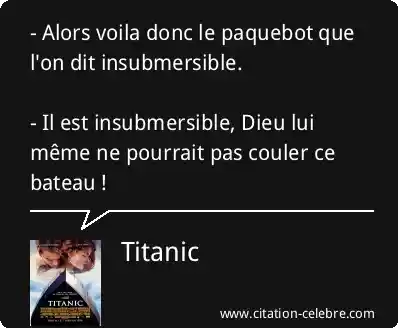 - Alors voila donc le paquebot que l'on dit insubmersible. - Il est insubmersible, Dieu lui même ne pourrait pas couler ce bateau !