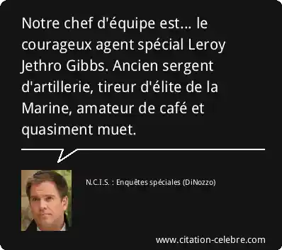 Notre chef d'équipe est... le courageux agent spécial Leroy Jethro Gibbs. Ancien sergent d'artillerie, tireur d'élite de la Marine, amateur de café et quasiment muet.
