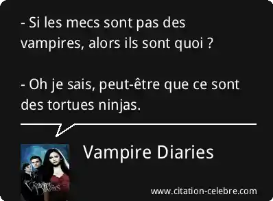 - Si les mecs sont pas des vampires, alors ils sont quoi ? - Oh je sais, peut-être que ce sont des tortues ninjas.