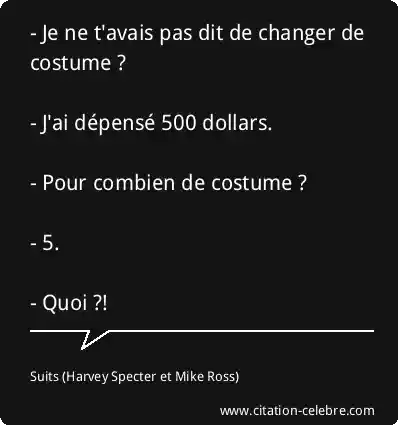 - Je ne t'avais pas dit de changer de costume ? - J'ai dépensé 500 dollars. - Pour combien de costume ? - 5. - Quoi ?!