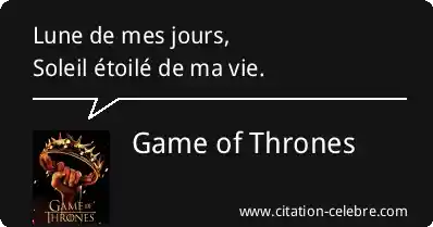 - Daenerys Targaryen : Drogo l'appelle « Lune de ma vie » (qui est le surnom utilisé dans votre réplique, « Lune de mes jours »). Dans la culture Dothraki, le Khal est le « Soleil et les Étoiles » et sa Khaleesi (sa reine) est sa « Lune », car elle est celle qui tourne autour de lui, mais qui est également essentielle pour le guider.