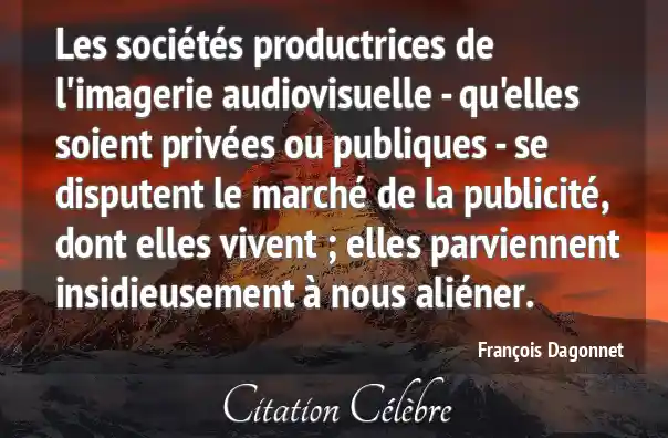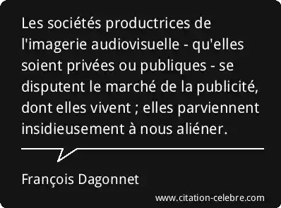 Les sociétés productrices de l'imagerie audiovisuelle - qu'elles soient privées ou publiques - se disputent le marché de la publicité, dont elles vivent ; elles parviennent insidieusement à nous aliéner.