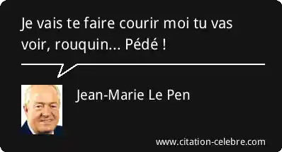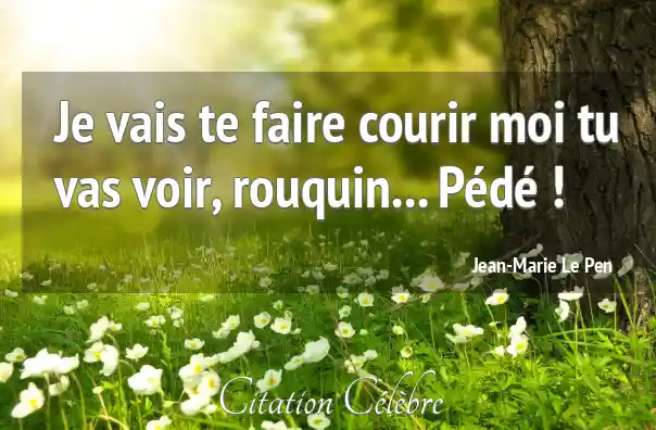 Cette phrase, attribuée à Jean-Marie Le Pen, est une interpellation agressive et violente. Elle exprime une menace de contrainte physique ("Je vais te faire courir moi tu vas voir") immédiatement suivie d'une insulte à caractère homophobe ("Pédé !") et d'une référence à la couleur de cheveux de la personne visée ("rouquin"). Le sens immédiat est celui de l'intimidation, de l'humiliation et de l'attaque personnelle basée sur des stéréotypes et des préjugés.