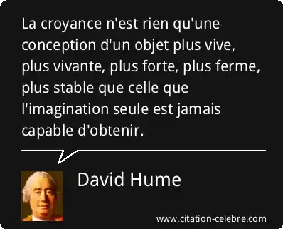La croyance n'est rien qu'une conception d'un objet plus vive, plus vivante, plus forte, plus ferme, plus stable que celle que l'imagination seule est jamais capable d'obtenir.