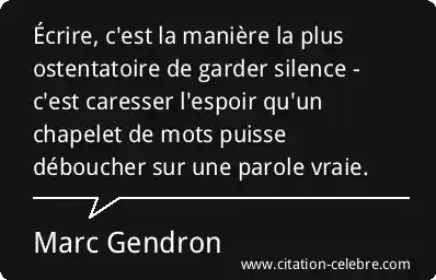 Écrire, c'est la manière la plus ostentatoire de garder silence - c'est caresser l'espoir qu'un chapelet de mots puisse déboucher sur une parole vraie.