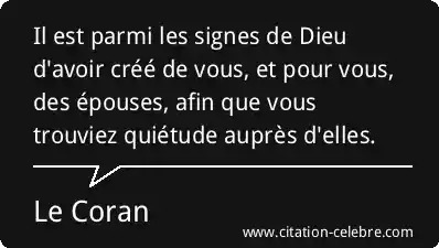 Il est parmi les signes de Dieu d'avoir créé de vous, et pour vous, des épouses, afin que vous trouviez quiétude auprès d'elles.